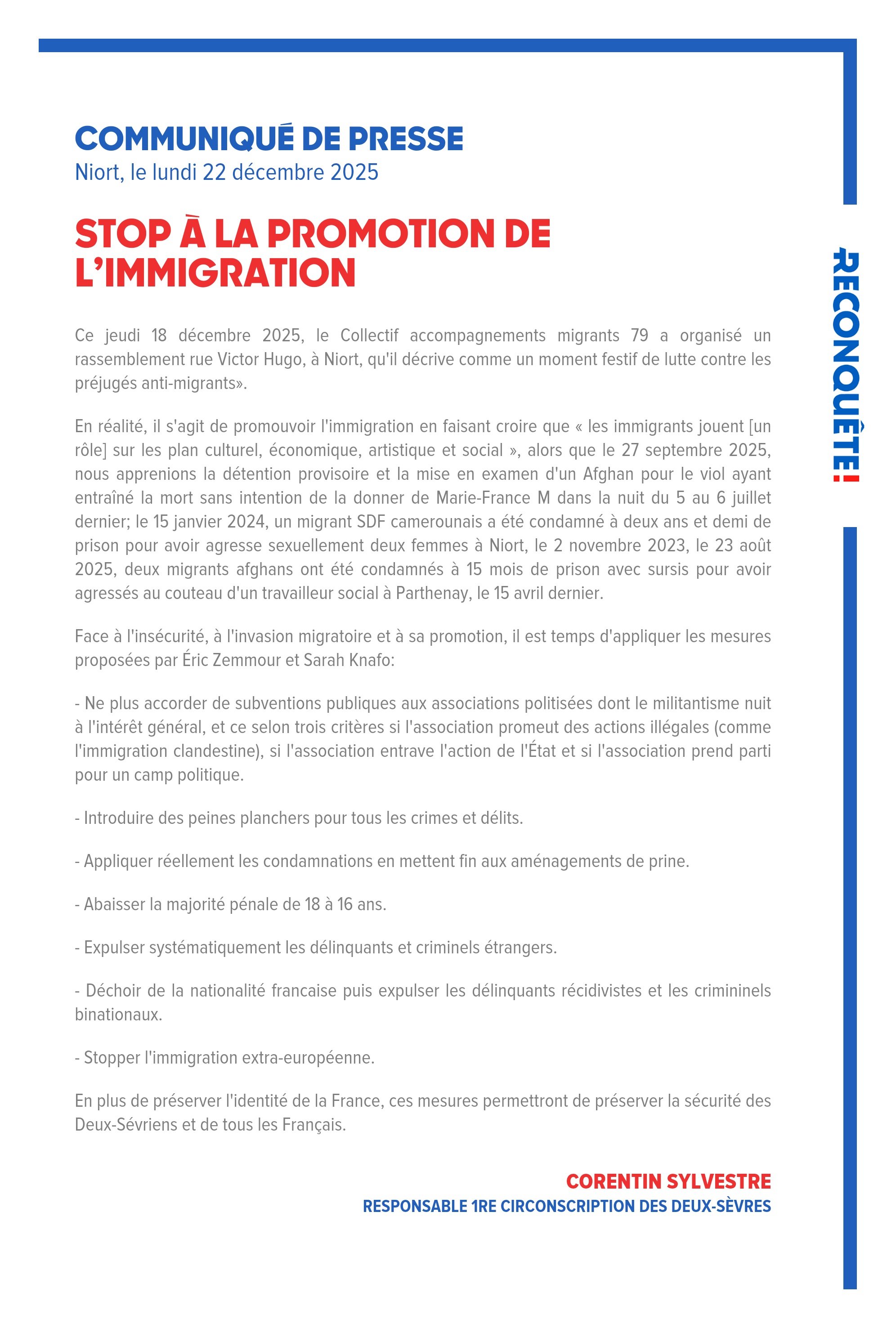 En réalité, il s'agit de promouvoir l'immigration en faisant croire que « les immigrants jouent [un rôle] sur les plan culturel, économique, artistique et social », alors que le 27 septembre 2025, nous apprenions la détention provisoire et la mise en examen d'un Afghan pour le viol ayant entraîné la mort sans intention de la donner de Marie-France M dans la nuit du 5 au 6 juillet dernier; le 15 janvier 2024, un migrant SDF camerounais a été condamné à deux ans et demi de prison pour avoir agresse sexuellement deux femmes à Niort, le 2 novembre 2023, le 23 août 2025, deux migrants afghans ont été condamnés à 15 mois de prison avec sursis pour avoir agressés au couteau d'un travailleur social à Parthenay, le 15 avril dernier.